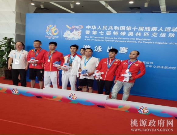 在刚刚结束的2019年全国第十届残运会暨第七届特奥会上,桃源籍残疾人运动员杨峰顽强拼搏,发挥出色,以1分3秒72的成绩获得S8级男子100米蝶泳冠军,同时还获得S8级男子仰泳铜牌。