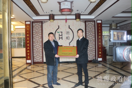 2018年12月26日,桃源县副县长严森柯在县残联理事长文俊陪同下,专程前往桃源县君和野茶开发有限公司,为该公司授予由省财政厅、省残联联合颁发的“十三五残疾人阳光扶贫省级示范基地”铜牌。2017年以来,该公司在县残联的支持下,结对帮扶80户贫困残疾人家庭,为自愿垦复老茶园的残疾人提供500元的复垦资金,为贫困残疾人家庭提供鲜叶收购高于市场价20%、每年给予保底分红等帮扶措施。该公司每年为80名贫困残疾人或家庭成员举办茶叶种植、茶叶制作技术培训班,对愿意来公司务工的残疾人优先安排就业。